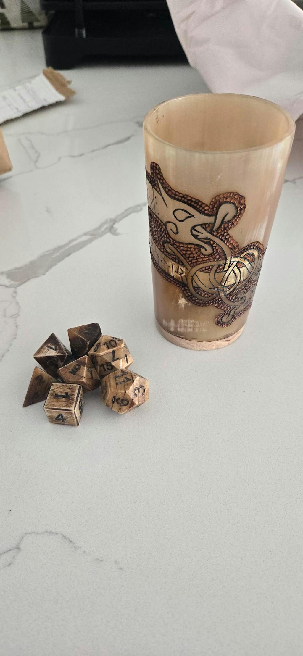 Love this DnD Dice set with horn shaker. I bought it for my husband fro Christmas this year, and I am so excited to give it to him. The dice and shaker are truly a work of art!