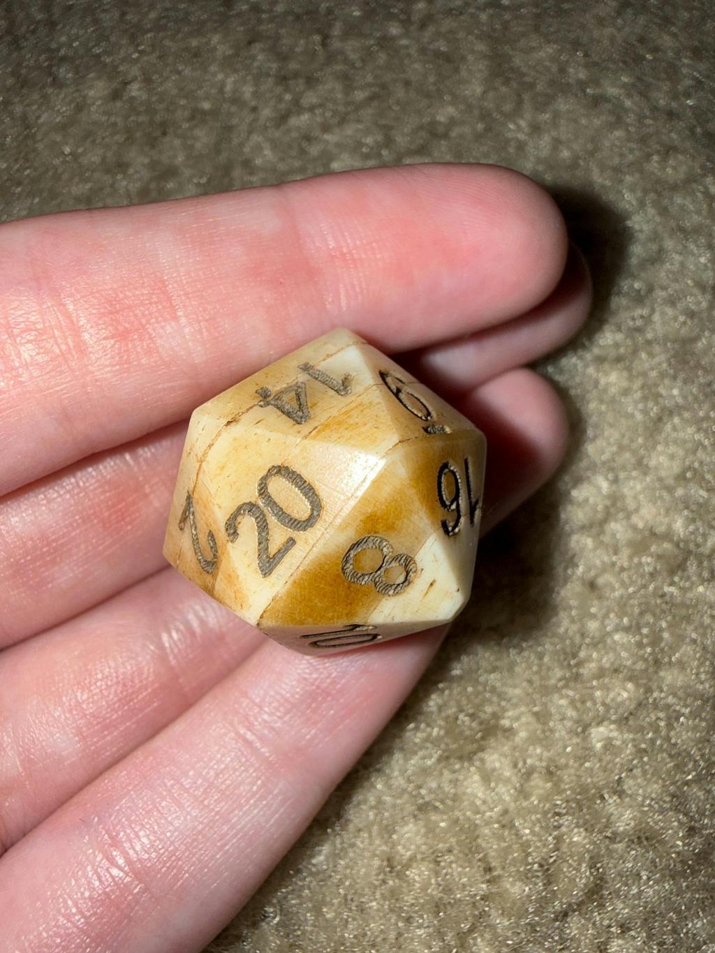 This was a perfect addition to my d20 collection! The bone makes for a really cool sound when it rolls on hard surfaces and it seems pretty well balanced. My friends will definitely be jealous of this! The numbers are well defined and easy to read as well. It is very clear this is made of real bone with some minor imperfections but that just makes it better imo