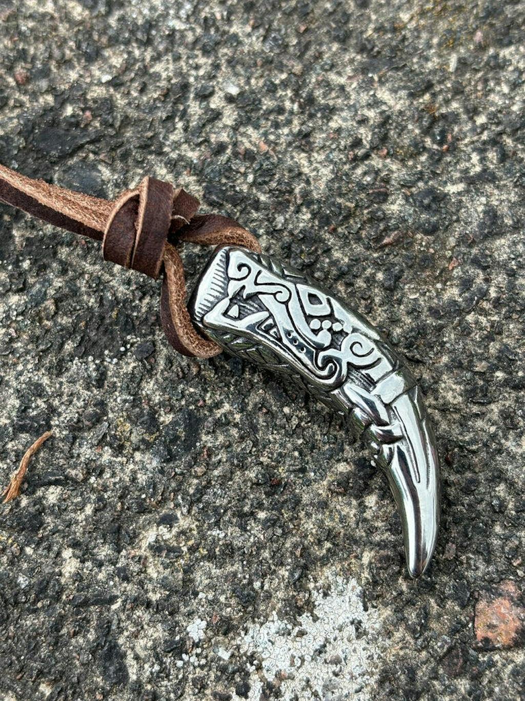 Fenrir’s Tooth Viking Necklace. Beautifully designed with a Nordic style Wolf and pattern